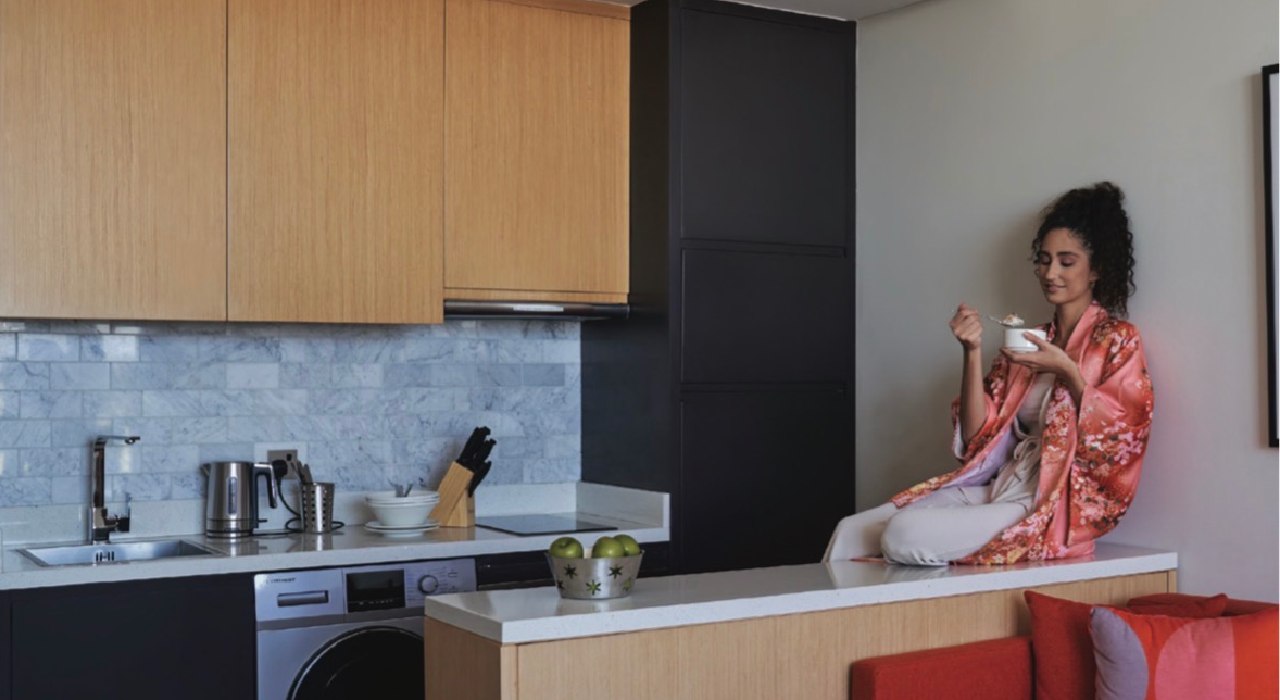 •  واحد یک خوابه: دارای اتاق خواب مجزا، سالن پذیرایی و آشپزخانه.